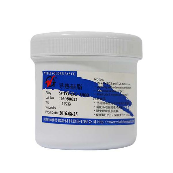 WTO-DG-3000 是一款以硅树脂基体的高性能的高温锡膏,被用于散热性要求较高的CPUs、 GPUs等芯片组件中。其优良的润湿性可使其迅速填充于界面的微孔中,极大程度的降低界面热阻。DG-3000 性能稳定,在正常储存条件下不会发干发硬,触变性好,利于客户使用。